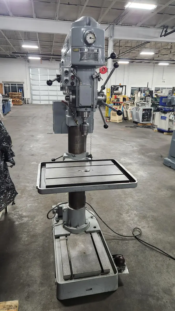 Alzmetall AB4 Drill Press, used, single-spindle. Features variable speed (80-720 rpm), drilling capacity 1.772" (cast iron), 3 feeds, MK 4 tool holder, large table area, 2.5 kW motor. Ideal for precision drilling. Specs: 27.55"x41.33"x76.77".