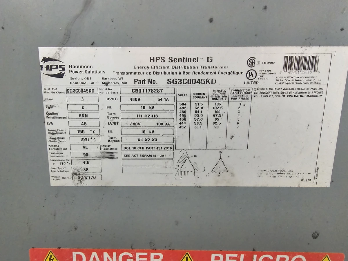 Hammond Power SG3C0045KD D16 Sentinel G 3Ph 45Kva 480D-240D/120Ct Aluminum 60Hz 150C 3R