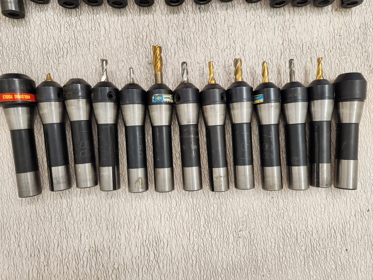 Used Iscar R-8 solid tool holders set includes 13 units, featuring models like ISCAR R8 EM 3/8 X 1.000E and ETM R8 EM 5/8" E. Ideal for tooling and accessories needs. Well-maintained in excellent condition.