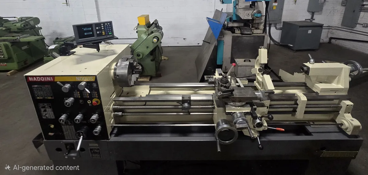 Used NARDINI Nodus ND1760 Gap Bed Engine Lathe, 17"/24" x 60", featuring AcuRite DRO, taper turning attachment, 12" 3-jaw chuck, Dorian quick change toolpost, and hardened ground bedways. Includes coolant system and removable chip pan.