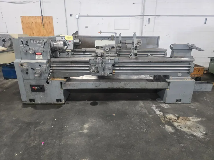 Used SUMMIT 20-4X80 Gap Bed Lathe: 20"/27" x 80", featuring inch/metric threading, 10 HP motor, hardened bed ways, and more. Specs include 15 spindle speeds (11.5-1400 RPM), 80" between centers, and equipped with a 10" Bison 3-jaw chuck and taper attachment.
