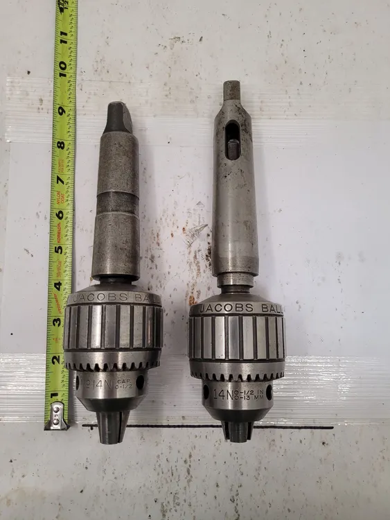 Jacobs Ball Bearing Super Chuck 14N, 3MT with 4MT Sleeve, set of 2. Ideal for tooling and drilling applications. Used condition, combined weight approx. 8 lbs. Model: 14N from JACOBS.