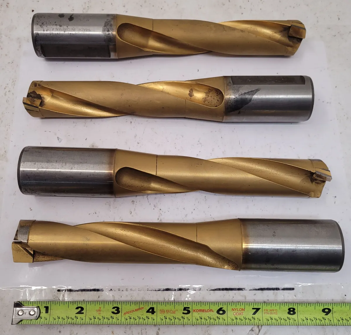 Sandvik 1-15/64" carbide jobber drill set in used condition. Lot of 4 drills, each approx. 9" long with a 2-flute design. Features a 2.75" shank and 1.5" diameter. Ideal for demanding drilling tasks. Explore industrial precision with Sandvik.