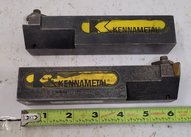 KENNAMETAL NEL-204D/NER-204D tooling set, lot of 2. Used condition, ideal for professionals needing versatile left/right-hand tools. Both have 1.25 in shank dimensions, F dimension of 1.5 in, and tool length of 6 in.