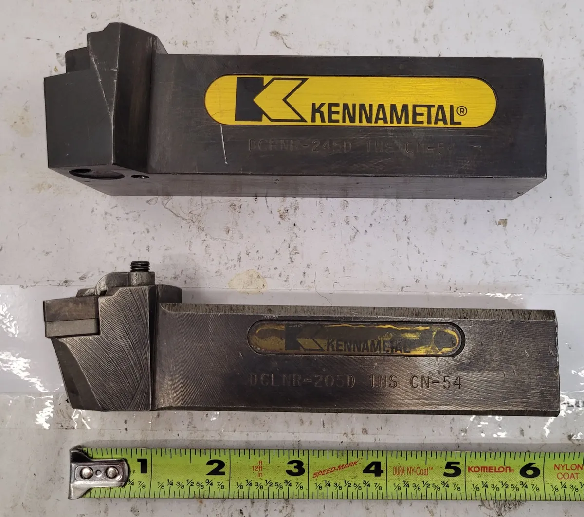 KENNAMETAL DCLNR/DCRNR Toolholders, used, lot of 2. Includes DCLNR-205D with 1.25" shank and DCRNR-245D with 1.5" square shank. Ideal for tooling needs. Note: DCRNR requires an insert clamp.