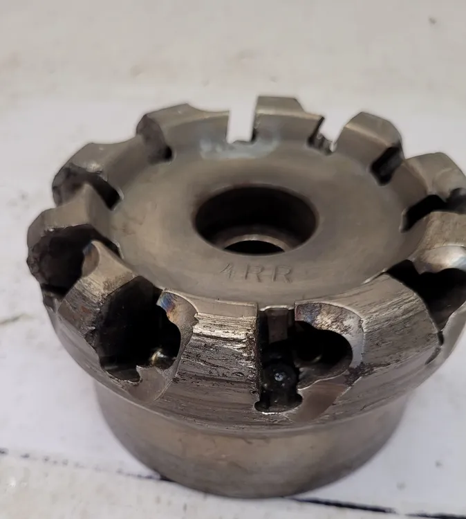 Mitsubishi AHX640WR 0410E used face mill with 4.5" head diameter and 10 inserts, ideal for precision milling. Features a 1.5" arbor on the back. Perfect for enhancing your tooling collection with reliable mill tooling.
