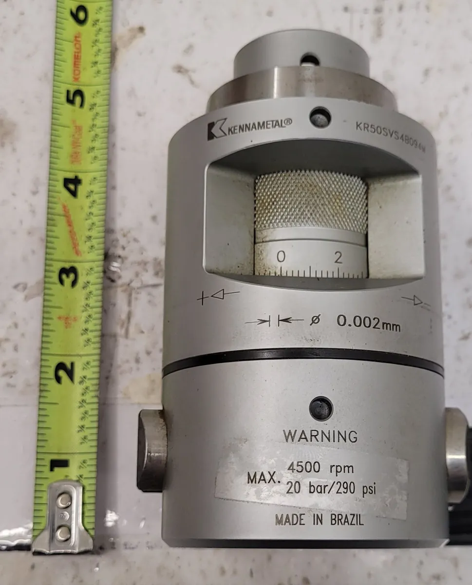 KENNAMETAL ROMICRON KR50SVS4B094M finish boring head, 78-98mm, used condition. Max 4500 RPM, 20 BAR/290 PSI, 7 1/8 projection. Ideal for precise machining. Manufacturer: KENNAMETAL, Model: KR50SVS4B094M. Suitable for tooling needs.