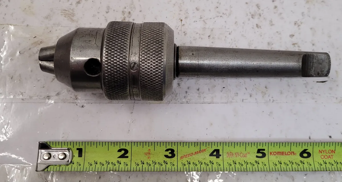 Ettco Keyless Drill Chuck No.2-AB, fits up to 25/64", with #2MT shaft. This used chuck offers convenient keyless operation for efficient tool changes. Ideal for tooling and accessories needs. Total length 6.25".