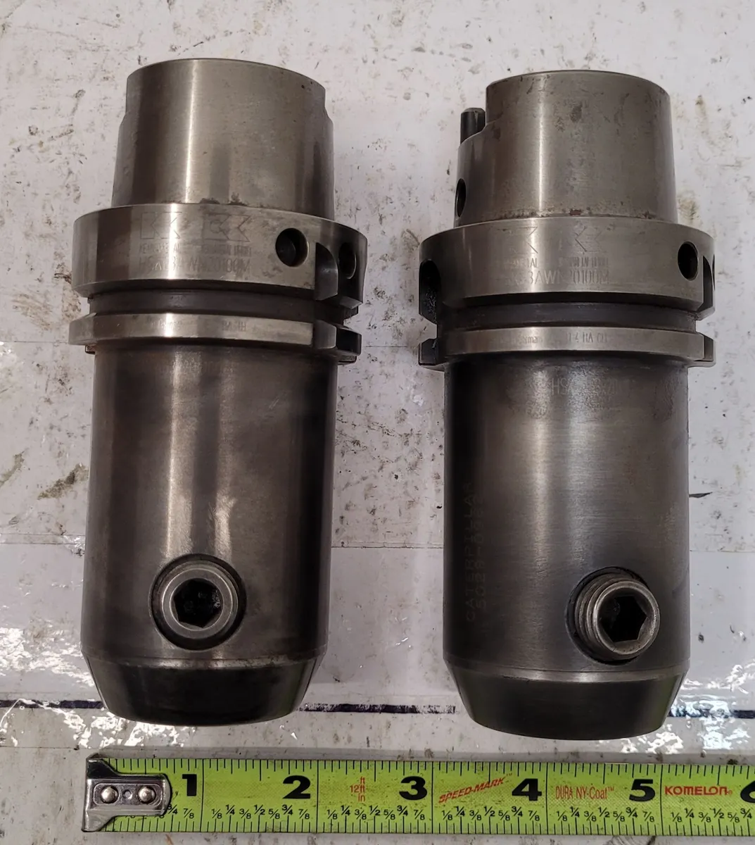 KENNAMETAL HSK63AWN20100M Whistle Notch Adapters, set of 2, used. Adapter/shank/bore diameter 0.787 in, body diameter 2.028 in, gage length 3.937 in. Ideal for precise tooling applications. Photos include diagram for reference.