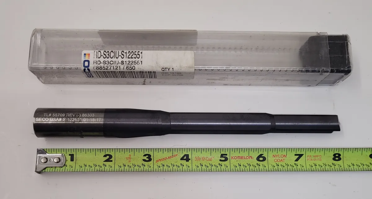 SECO RD-S3CIU-S122551 tooling accessory, used. Dimensions: OAL 8.0", Shank Dia 0.78", Shank Length 1.74", Head Dia 0.55", Head Length 6.26". Equipped with 2 flutes, ideal for precision tasks.