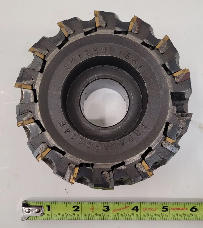 Mitsubishi FBP415R0514E 5" Face Mill with 14 flutes, designed for precise machining. Used condition, includes coolant through feature. Ideal for high-performance milling tasks. Cutting diameter: 5", Overall length: 62mm. Perfect for your tooling needs.
