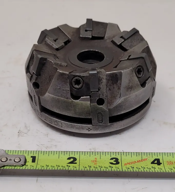 I GET ALLOY DNF80R 808 indexable insert face mill, used. Cutter diameter 3.5", OAL 1.90", bore diameter 1.0", hub diameter 2.36". Six insert slots. Ideal for precise machining needs.