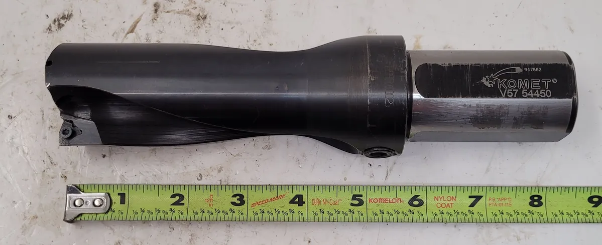 KOMET V57 54450 Indexable Drill for sale. Used tooling & accessories with 2 flutes; 8.125" OAL, 2.5" shank length, 1.37" shank width, 5.625" flute length, and 1.70" flute diameter. Ideal for precise drilling tasks.