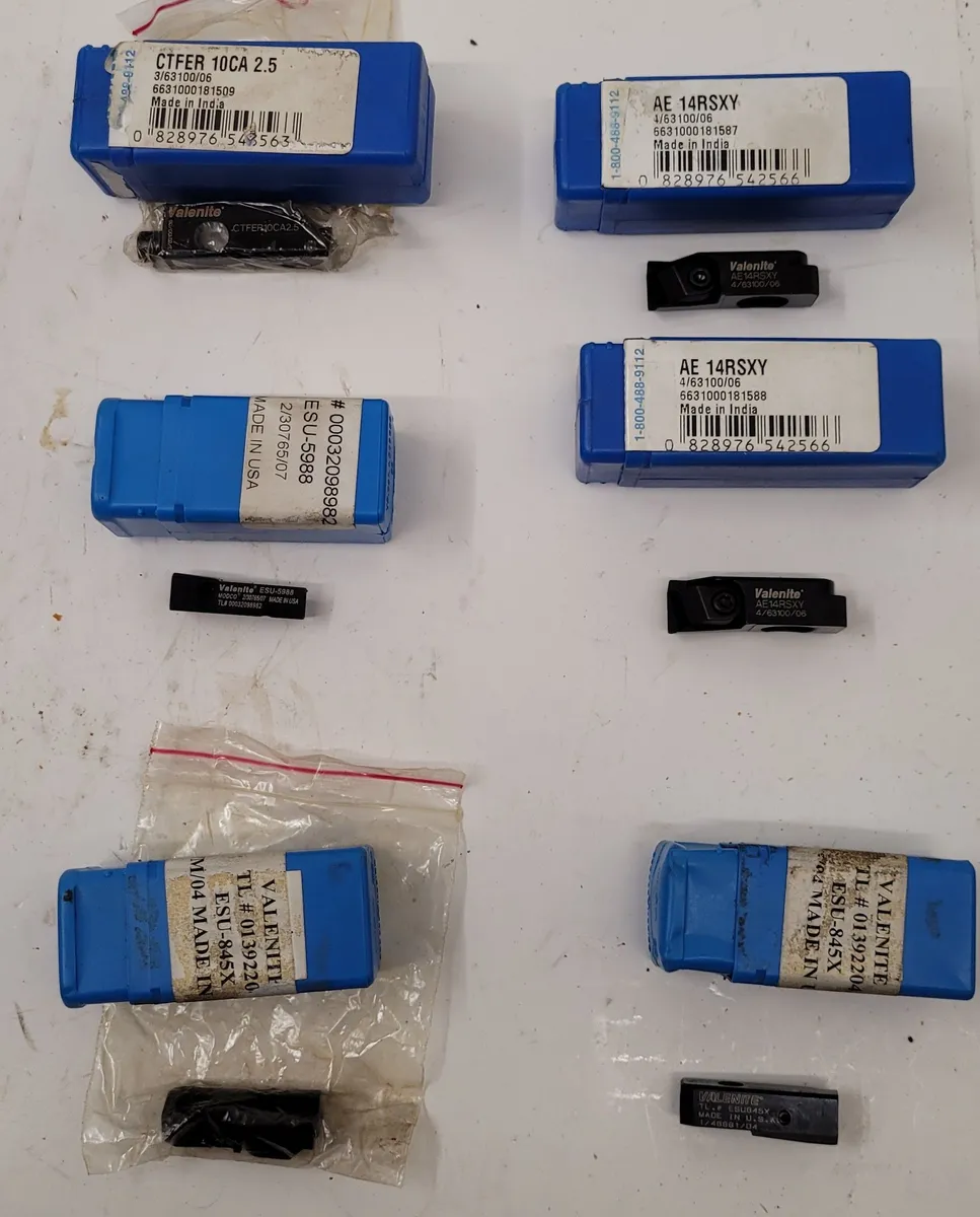 WALTER Valenite indexable tool holder insert cartridge set of 6 in used condition. Includes various sizes: TL# 0139220-2, AE 14RSXY-2, TL# 00032098982-1, CTFER 10CA 2.5-1. Ideal for multi-purpose tooling needs.