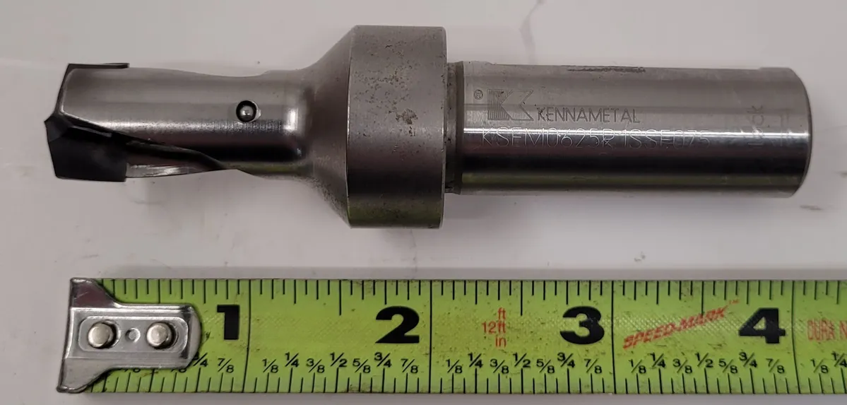 Kennametal KSEM0625R1SSF075 used indexable drill, ideal for precise drilling. Features coolant through, 5/8" cutting diameter, 3/4" shank, 2 flutes, and 4” overall length. Perfect for tooling and accessory applications.