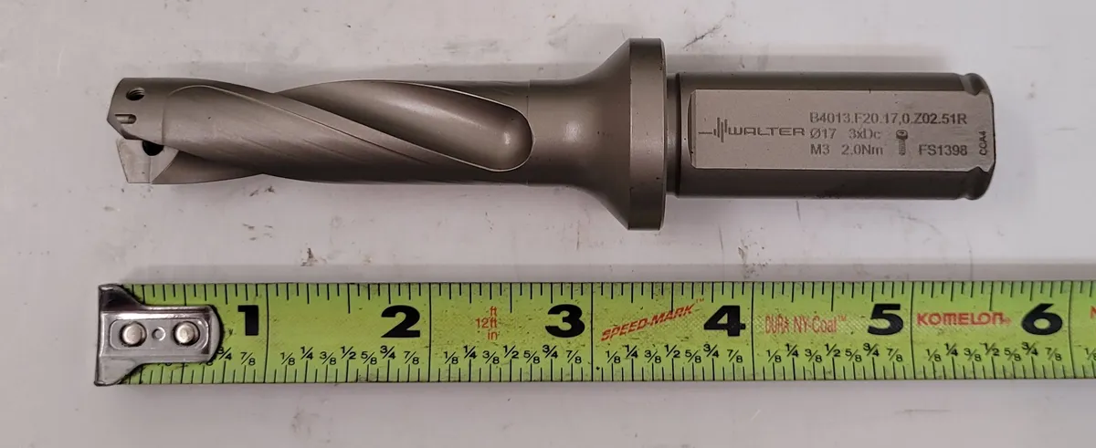 New Walter XTRA-TEC B4013.F20.17,0.Z02.51R drill; 17MM indexable insert, right-hand use, 2 helixed flutes. Dimensions: Min cut .669", max .708", protruding length 3.464", usable length 2.125", OAL 5.433". Versatile and precise.