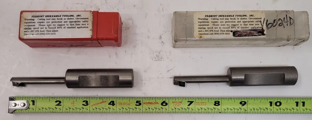 Vermont Indexable Tooling V6024D carbide insert tools, set of 2, used. Specs: 4.61" OAL, 0.4" body diameter, 0.75" shank diameter, 2.5" shank length. Suitable for precise machining tasks. Model: V6024D.