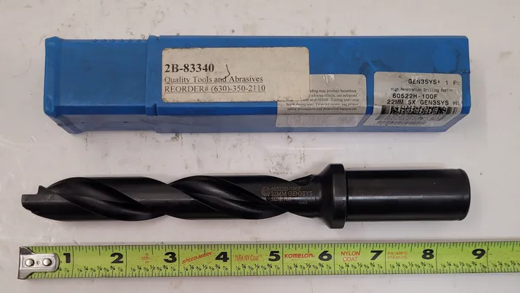 Allied Machine & Engineering AMEC 60522H-100F used indexable spade drill. Features a replaceable body, 0.8661-0.9448 inch diameters, 4-23/32 inch drill depth, flanged shank, and helical flutes. Ideal for precision tooling.