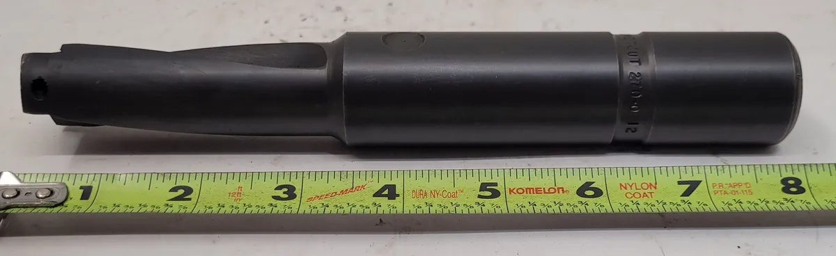 Kendex Metcut 270-0112 Indexable Carbide Coolant Drill. Used tooling and accessory for drilling, featuring an OAL of 8.125", 1-1/4" shank, 1-1/8" cutting dia., 2 flutes, 3" flute length, and 4.75" shank, ideal for precision tasks.