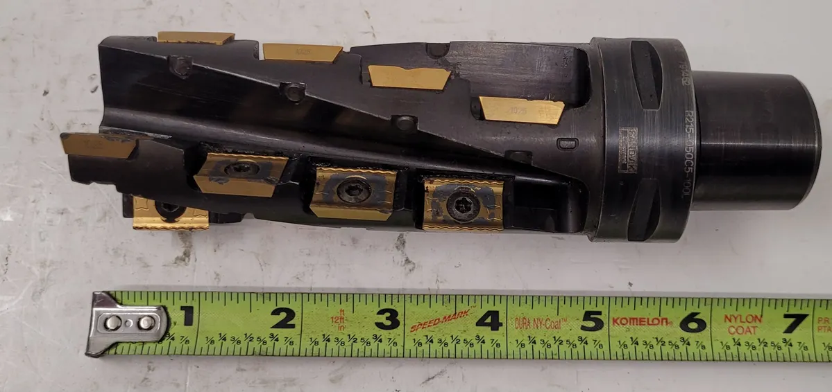 Sandvik Coromant R215-050C5-100L Square Shoulder Mill, used, offers precision cutting with 4 flutes and 16 inserts. Right-hand cut direction, 6.752" overall length, 3.937" max depth cut. Ideal for demanding tooling applications.