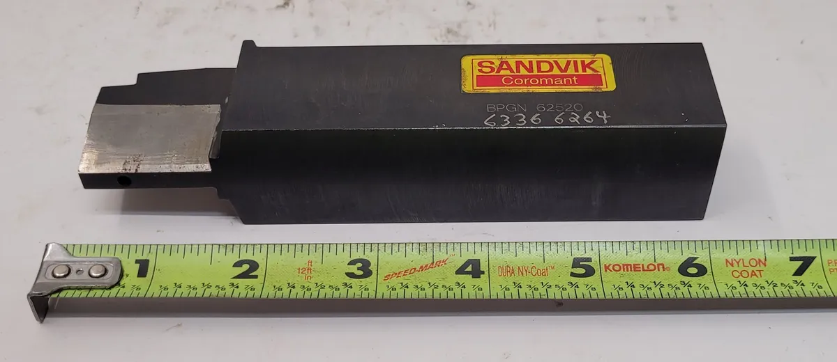 Sandvik Coromant BPGN 62520 Carbide Insert Tool, pre-owned. Max cutting depth: 1.38 in, neutral hand, 1.25 x 1.25 in rectangular shank, 6 in overall length. Ideal for precise turning and grooving tasks, standard 12.7 mm insert seat.