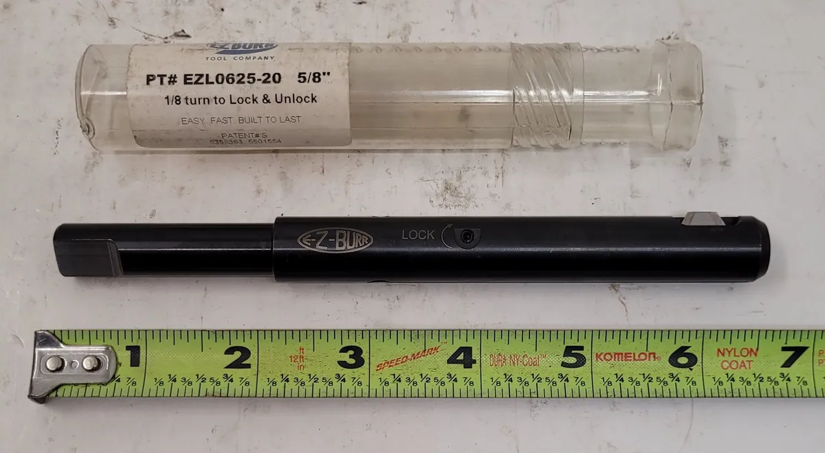 Used E-Z BURR EZL0625-20 deburring tool; ideal for 5/8-inch hole. Specs: 0.5" shank dia, 7" OAL. Model L3B with 1/8 turn unlock feature. Perfect addition to your tooling collection.