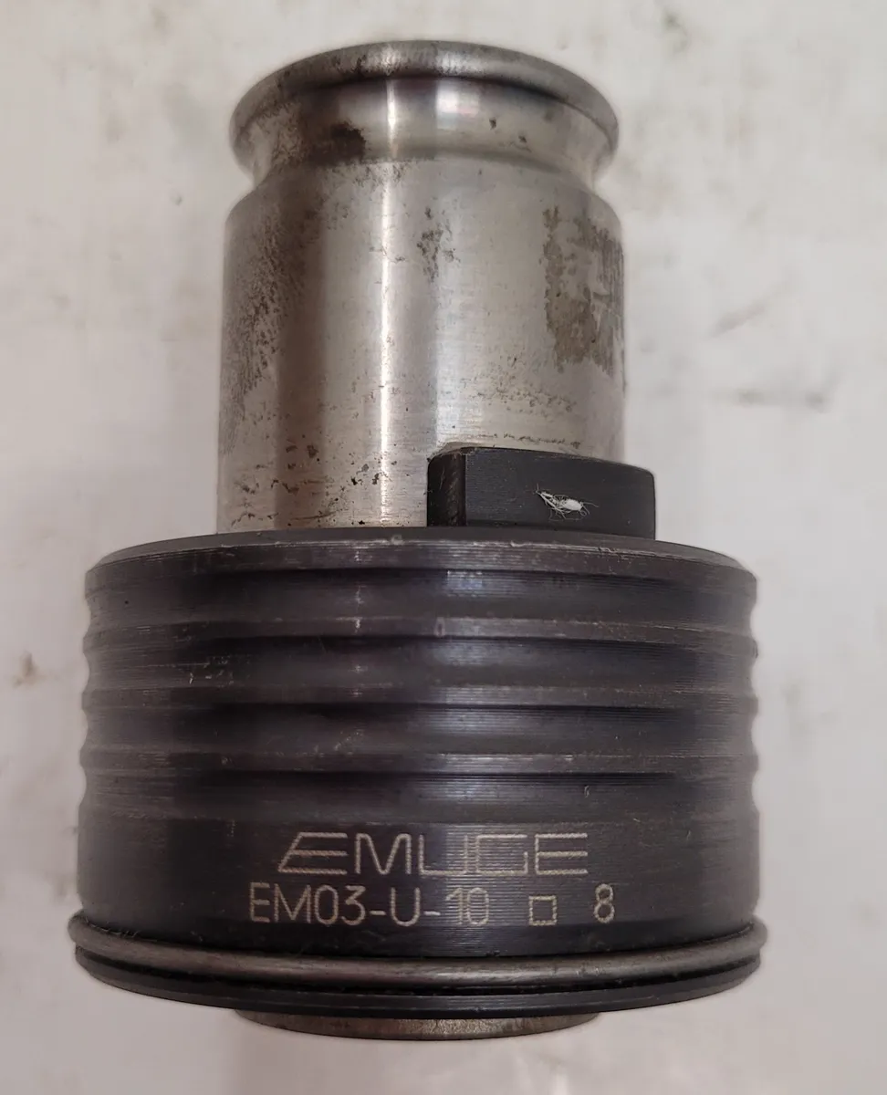 EMUGE EM03-U-10 Quick Change Tool Holder available. Features quick-change adapter, type size 03, and IC lubrication. Cutting range (M) 10, 10 mm clamping diameter, and 8 mm shank square. Includes overload clutch. Used condition.