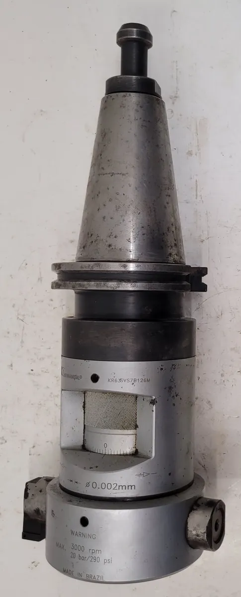 Kennametal KR63SVS7B126M ROMICRON fine boring head with CAT50 holder. Used, 138-161mm range, 85mm body diameter, 7.25in projection, 11.5in overall length. Ideal for precision tooling tasks.