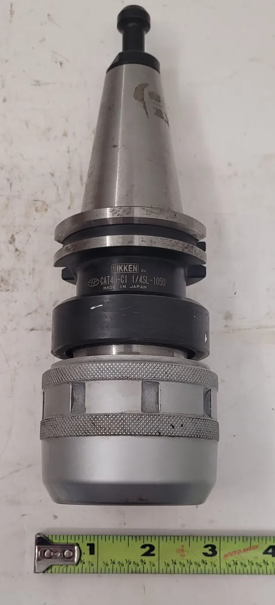 NIKKEN CAT 40-C1 1/4SL-105U milling chuck holder, used. Features: CAT40, 2.36 in nose diameter, 3.15 in projection, 8,000 RPM max speed. Clamping range 1/8 in to 1 in, coolant through. Ideal for tooling applications.