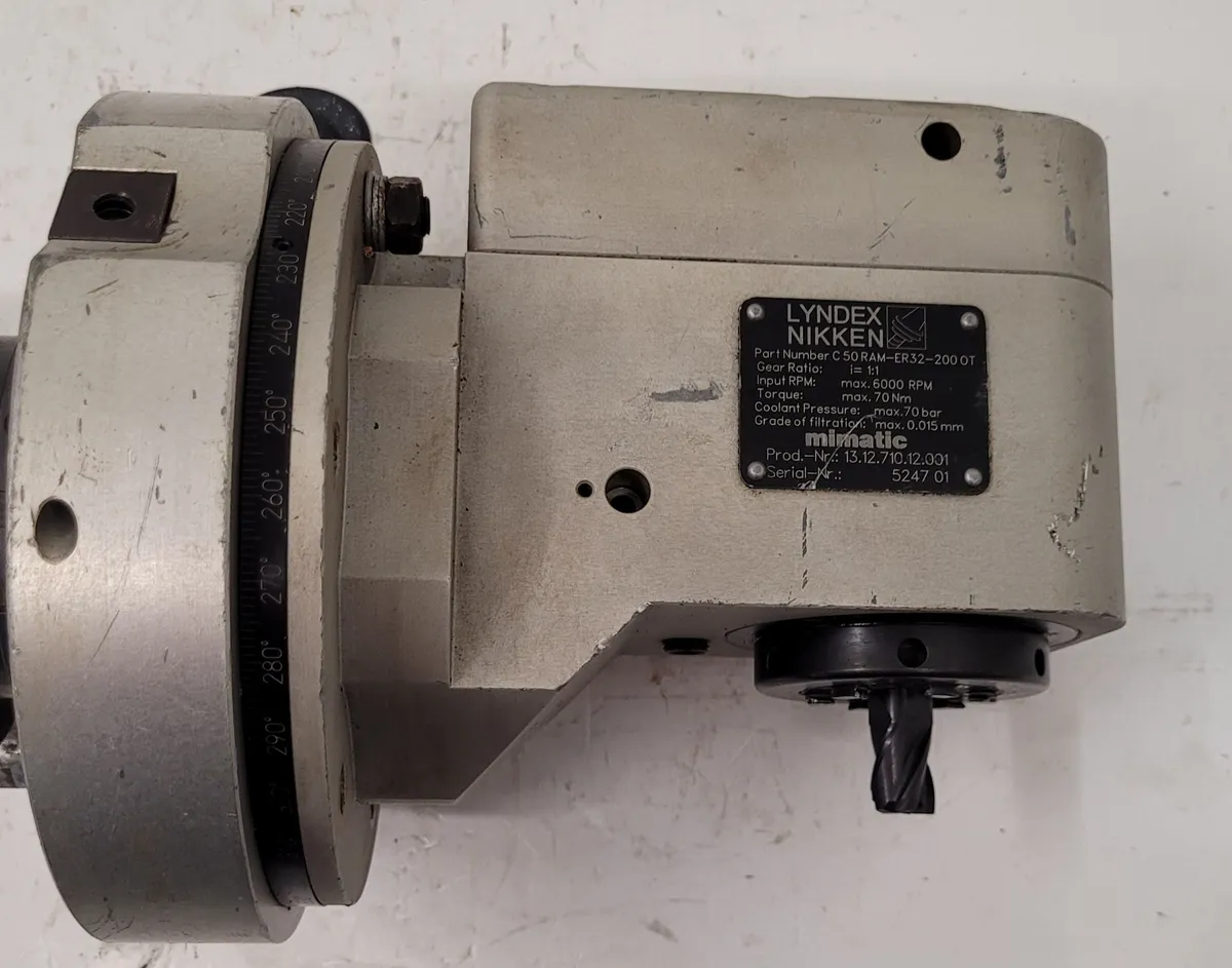 Lyndex Nikken C50 RAM-ER32-200 0T Right Angle Head CAT 50. Used tooling; max RPM 6000, torque 70Nm, coolant pressure max 70 bar. Includes OAL options of 14" or 16" and 1:1 gear ratio. Ideal for various machining applications.