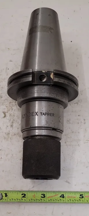 LYNDEX Tapper with CAT50 Holder in used condition. This tooling accessory offers a 1.25in bore diameter, 2.0in body diameter, 5.25in projection, and 9.25in overall length. Ideal for precision tasks demanding reliability.