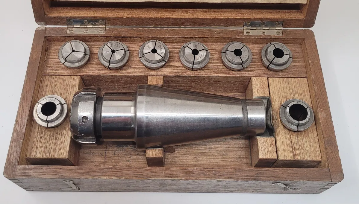SPRING NT50 Collet Chuck by Spring, used, ideal for tooling needs. Measures 7-7/8" OAL, 2.44" nut diameter, includes 8 varying-size collets. Comes in a wooden box, perfect for organized storage. Enhance your setup with this versatile tool.