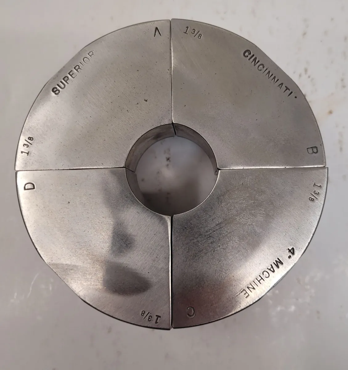 Superior Cincinnati 1 3/8" S-Style Emergency Collet Pad, used condition. Ideal for tooling & accessories, offering a 2” height and non-serrated interior. Perfect for precise applications.