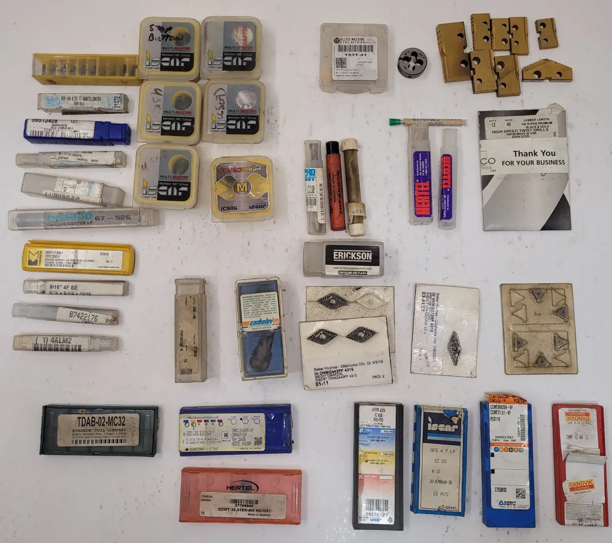 Assorted 40-piece tooling set in used condition. Includes variety of incomplete insert packs: Iscar, Baker Hughes, Kenloc, SECO, and more. Features end mills, drill bits, collets, and cutters from multiple brands. Perfect for diverse tooling needs.