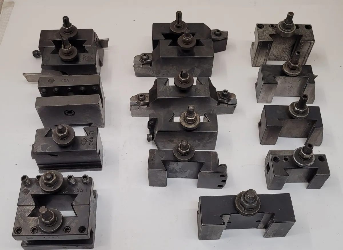 Optimize your lathe setup with this Aloris Tool Post Holder set, featuring 22 pieces including models CXA-12, CXA-1, CXA-7, CXA-8, CXA-71, CXA-6, and CXA-16. Nine additional unidentified posts included. Used, excellent for versatile tooling needs.