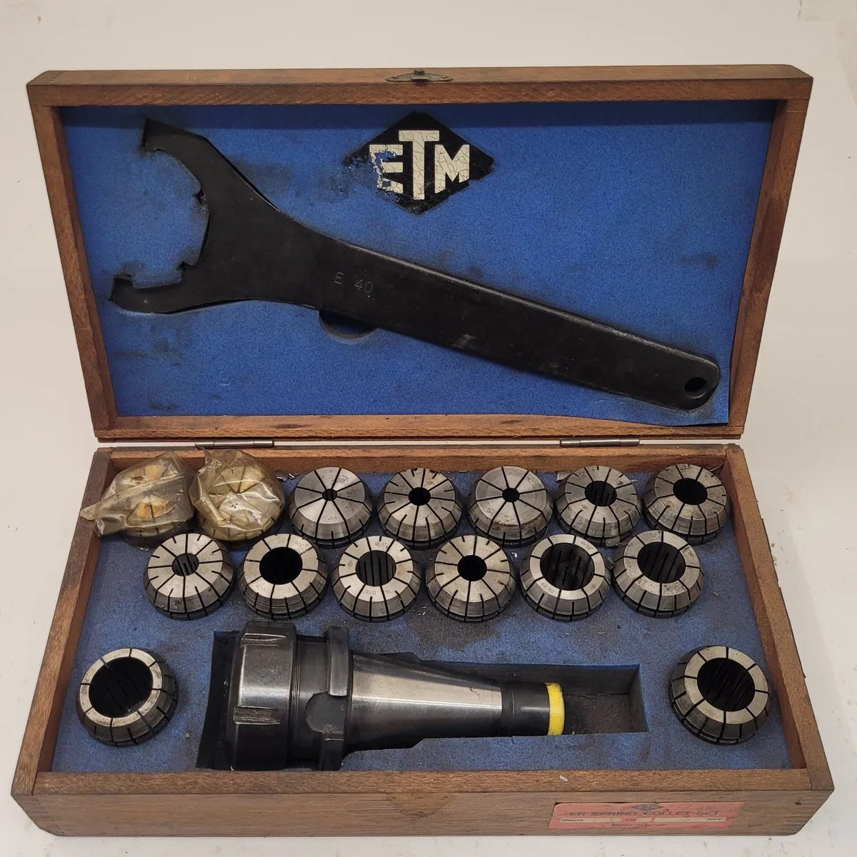 ETM ER Spring Collet Chuck & Set, used. Includes an ER40 Collet Chuck (2.156" projection), CAT 40 Holder, nut diameter 2.48", and overall length 5-3/4". Comes in original wooden box with a wrench and 15 ER40 collets.