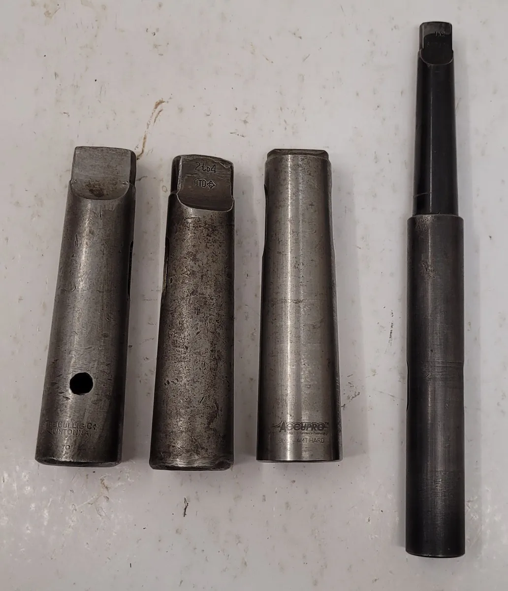 Enhance your tool collection with this used Collis Morse Taper Sleeve Set. Includes 4 sleeves: 2MT to 4MT, 3MT to 4MT, and 1MT to 2MT. One sleeve is ACCUPRO, ensuring diverse fitment options. Ideal for tooling needs.