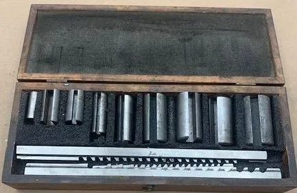 DUMONT #10, Minute Man Broach SET – 13-piece HSS Fractional Keyway Broach Set in its original wood case. Includes broaches: 1/8"-B to 3/8"-C and collared bushings: 1/2"-B to 1-1/2"-C. Condition is used. Ideal for precise tooling needs.