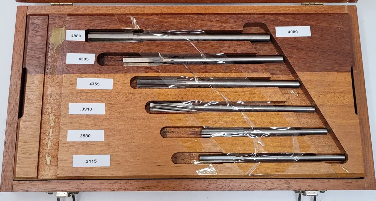 Nielsen Dowell Reamers, used condition, tooling & accessories. Includes sizes: .3115, .3580, .3910, .4355, .4385, .4980. Wood box intact. Ideal for precise projects and various applications.
