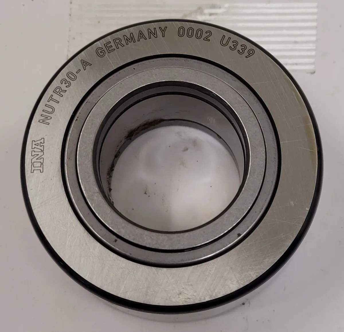 INA NUTR30-A Yoke Track Roller in used condition. Features include heavy yoke style, crowned shape, 62 mm roller diameter, and 30 mm bore diameter. Dynamic load capacity: 13,300 lbs; static: 17,800 lbs; max speed: 2,600 RPM.