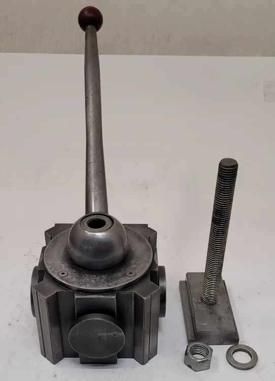 Enco Quick Change Lathe Tool Post, used condition, by Enco Manufacturing. Serial: 28551. Dimensions: H 4.25", 5 sq. in. Ideal for lathe tooling. Perfect for enhancing your precision and efficiency in machining tasks.
