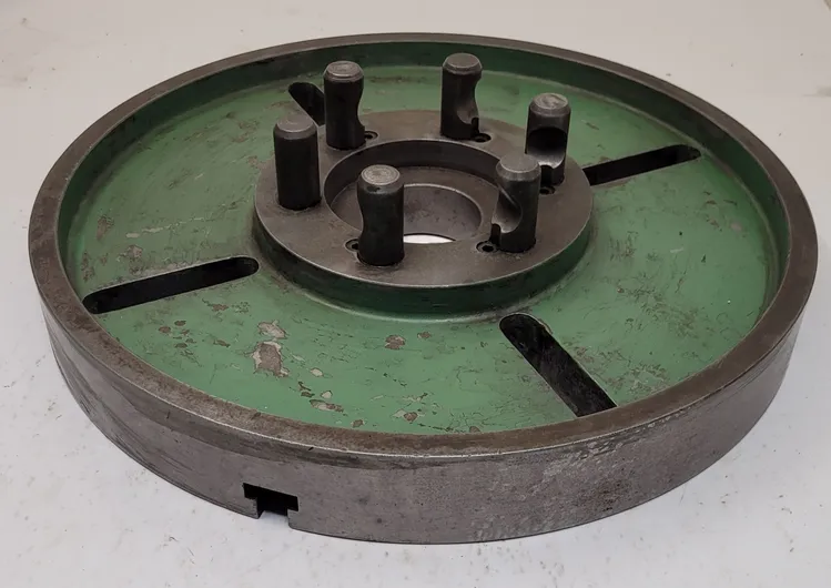 D1-6 Lathe Chuck Back Plate - Used tooling accessory with 16in overall diameter, 6 pins at .875” each. Ideal for lathe operations. Outer diameter: 7in, inner: 4in, center hole: 2.5in, thickness: 2in. Model: D1-6.