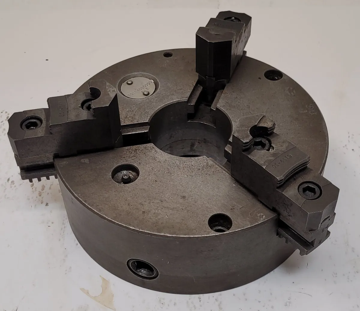 Cushman 1010408000D/6-E lathe chuck with 8.25-inch overall diameter, 3 jaws, 2.5-inch center hole, and 3-inch thickness. Ideal for tooling and accessories in machinist applications. Used condition, model 6E.