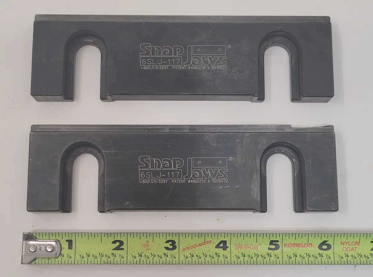 Snap Jaws 6SLJ-117 used quick change vise jaws offer precision and durability for 6 in vises. Made of hardened steel, these fixed jaws feature a low profile, 6 in width, and a thin ledge for versatile tooling needs. Set includes 2 step-shaped jaws.