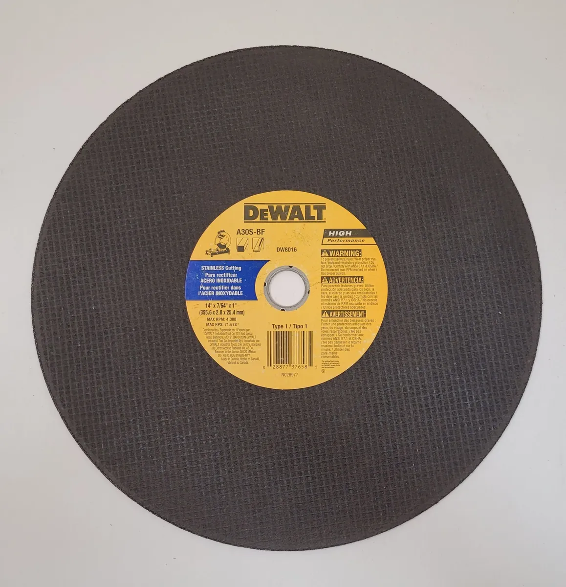 Used DEWALT A30S-BF Type 1 cutting disc, 10-pack. Model DW8016, dimensions 14x7/64x1. Ideal for tooling applications. Max 4300 RPM. Durable and reliable for various projects.