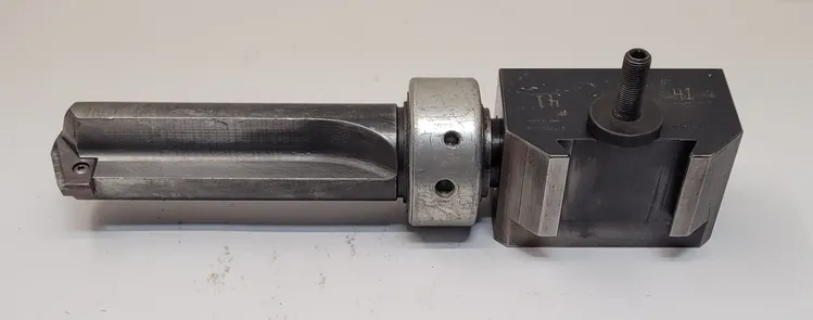 Used AMEC 22050S-005I straight flute spade drill by Allied Machine & Engineering. MT5 shank, 2 flutes, short length. Includes 2T-6SR coolant adapter, Dorian QITP50-5-5 tool post holder. Ideal for precise, high-performance drilling.