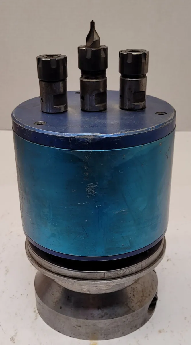 Boost your drilling efficiency with this used 3 Spindle Drilling Head Attachment. Fits 4" spindles, stamped B143P0479. Ideal for tooling and accessories. Dimensions: 9" H, 2 1/4" spindle height, 1-5/8" off center. Perfect for precision tasks.