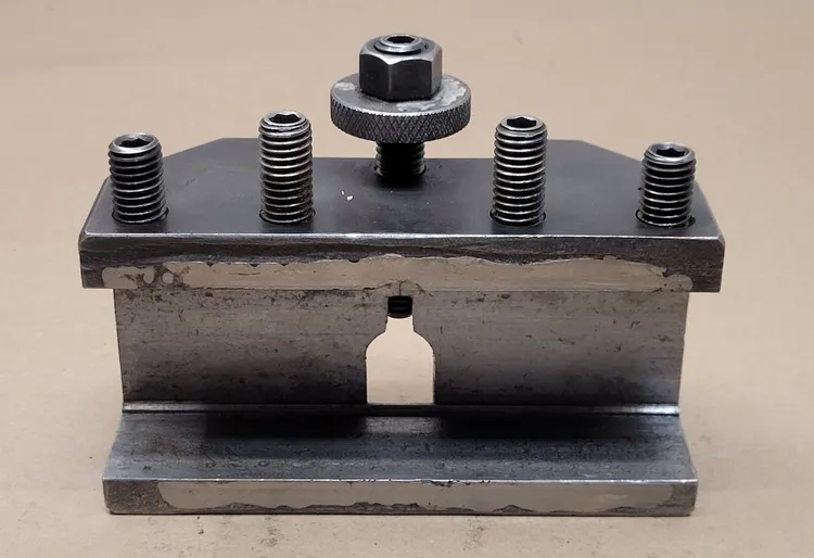 Used Lathe Tool Post Holder for sale. Dimensions: 3-1/4" H, 6" L, 2-3/8" W, 2-3/4" wedge, 2-1/8" capacity. Ideal for tooling applications. Compact and efficient design. Act now to upgrade your equipment.
