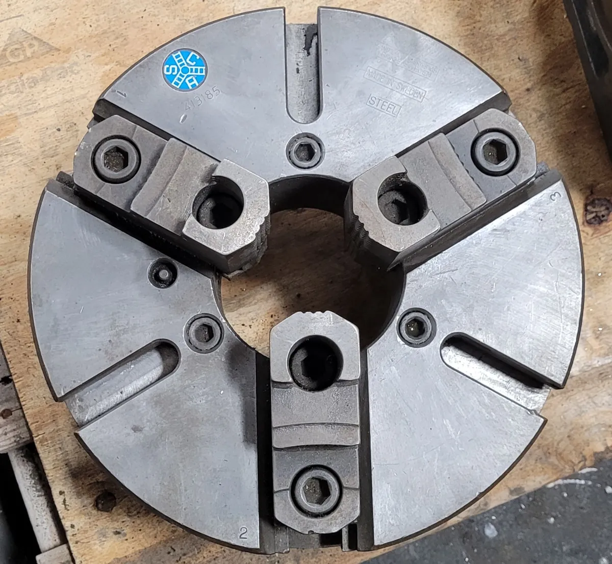 SCA 12" 3 Jaw Chuck, Model 413185, used condition. Features 12" diameter, D1-8 mount, 4" center hole, 3 T-slots, and 6 pins. Ideal for lathe setups looking for reliable tooling and accessories.