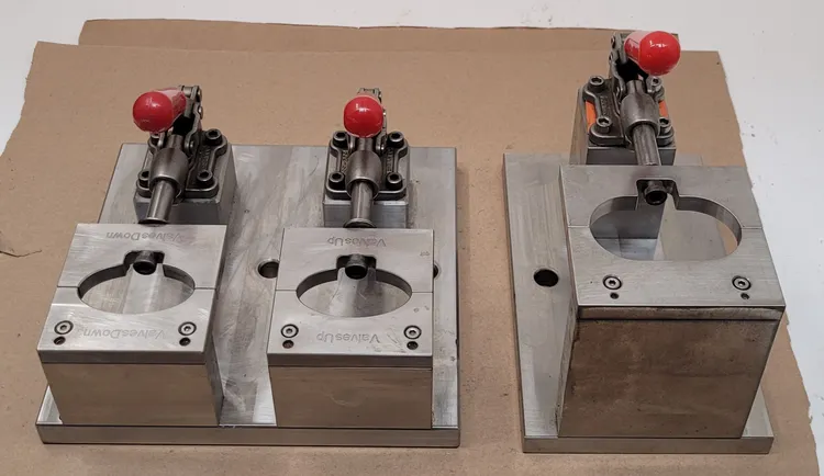 Set of 3 used DESTACO 603-SS straight-line action clamps. Ideal for tooling, each clamp features a 5/16 in thread size, 0.47 in plunger dia, and 4.77 in overall length. Clamps include bases as shown. Perfect for professional applications.